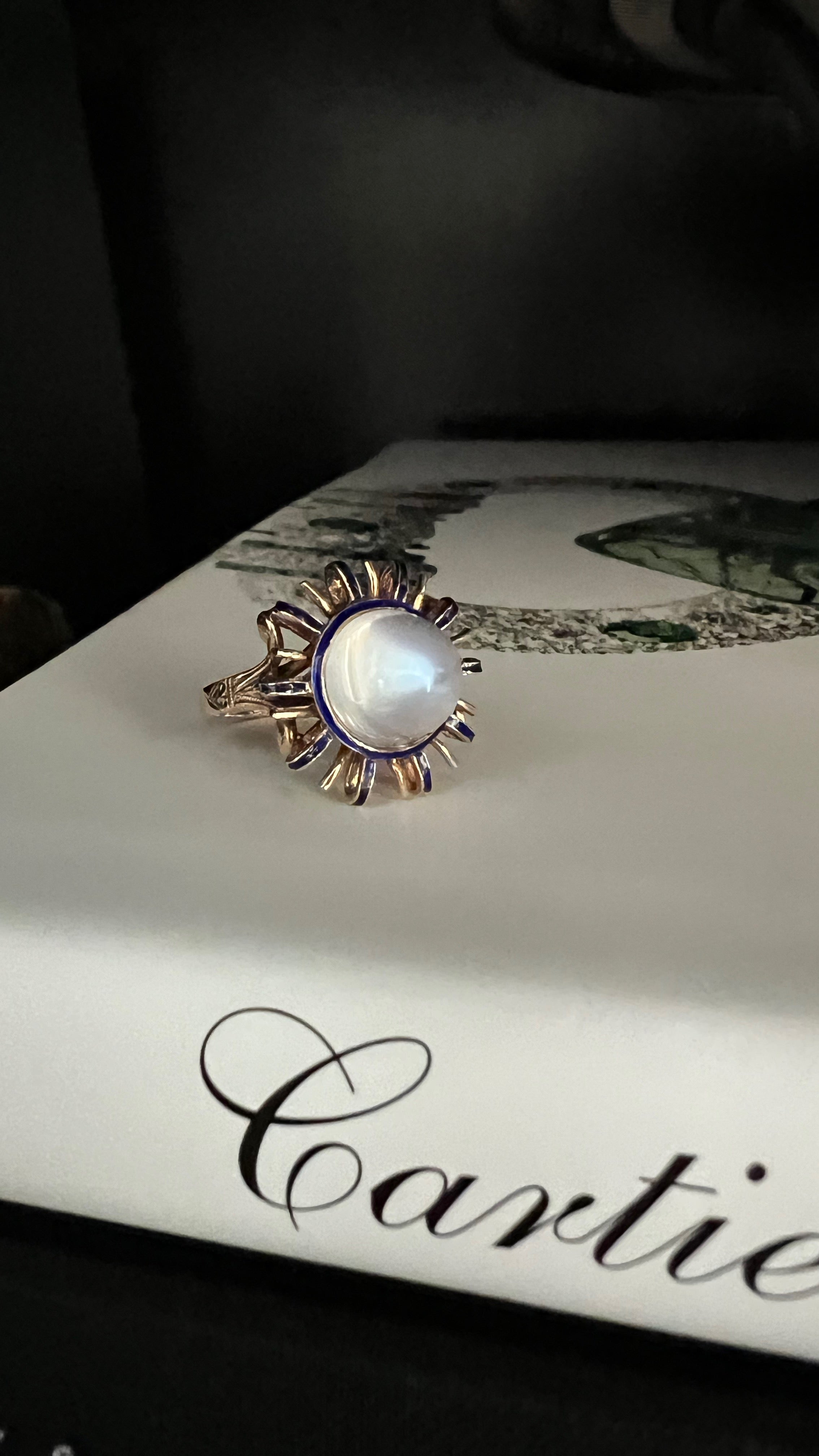 The cabochon bullet-cut moonstone provides a powerful center in t he is 14K setting with lovely royal blue enamel. The enamel is still in excellent shape for being made in the 1960s!
