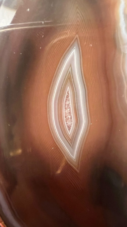 In the agate, you'll notice shades of brown, rust, green, and white. It's quite a specimen!