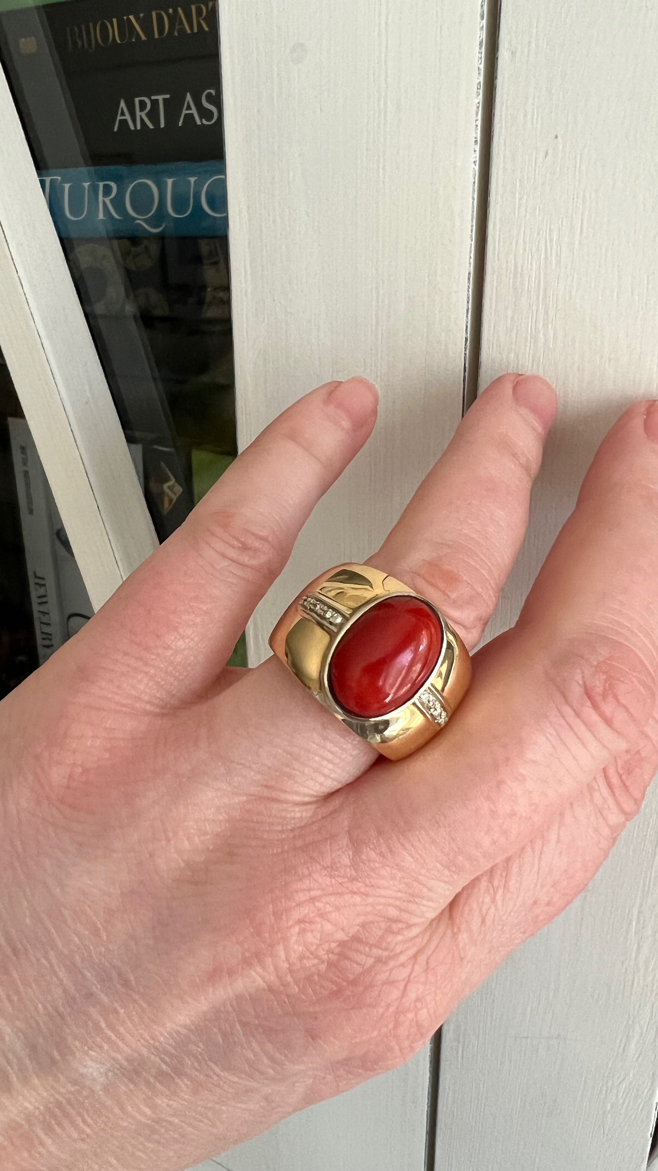 Oh, how I love coral -- must be my Italian roots! This chunky 18K ring features a stunning piece of Sardinian coral. You can see in one of the videos how in different lights it can turn more of a deep orange to a deeper red. No matter the light, it's incredible!