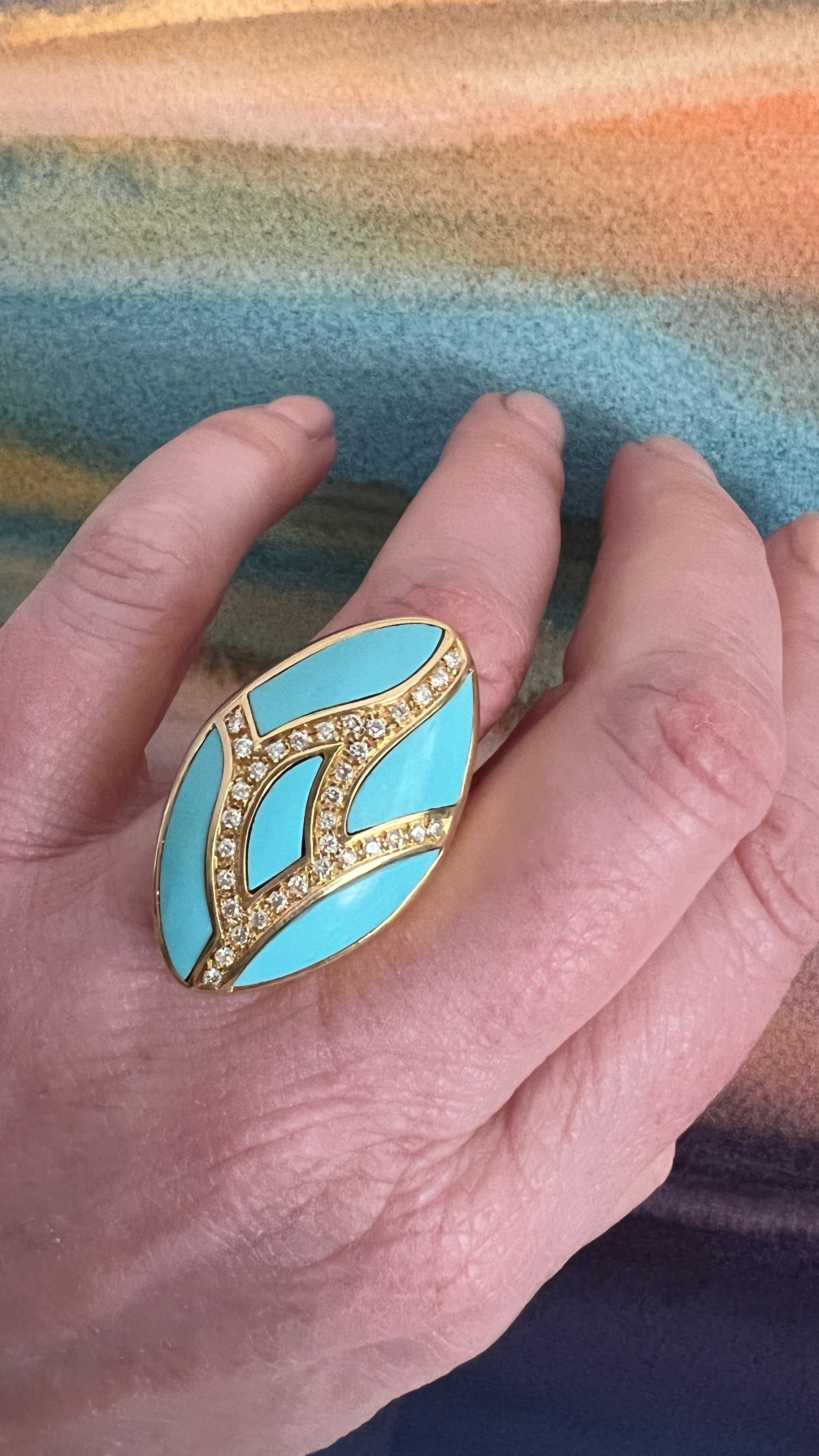 I adore the design with the ribbons of gold and diamonds as they weave through the turquoise. There's about .45 ctw in diamonds.