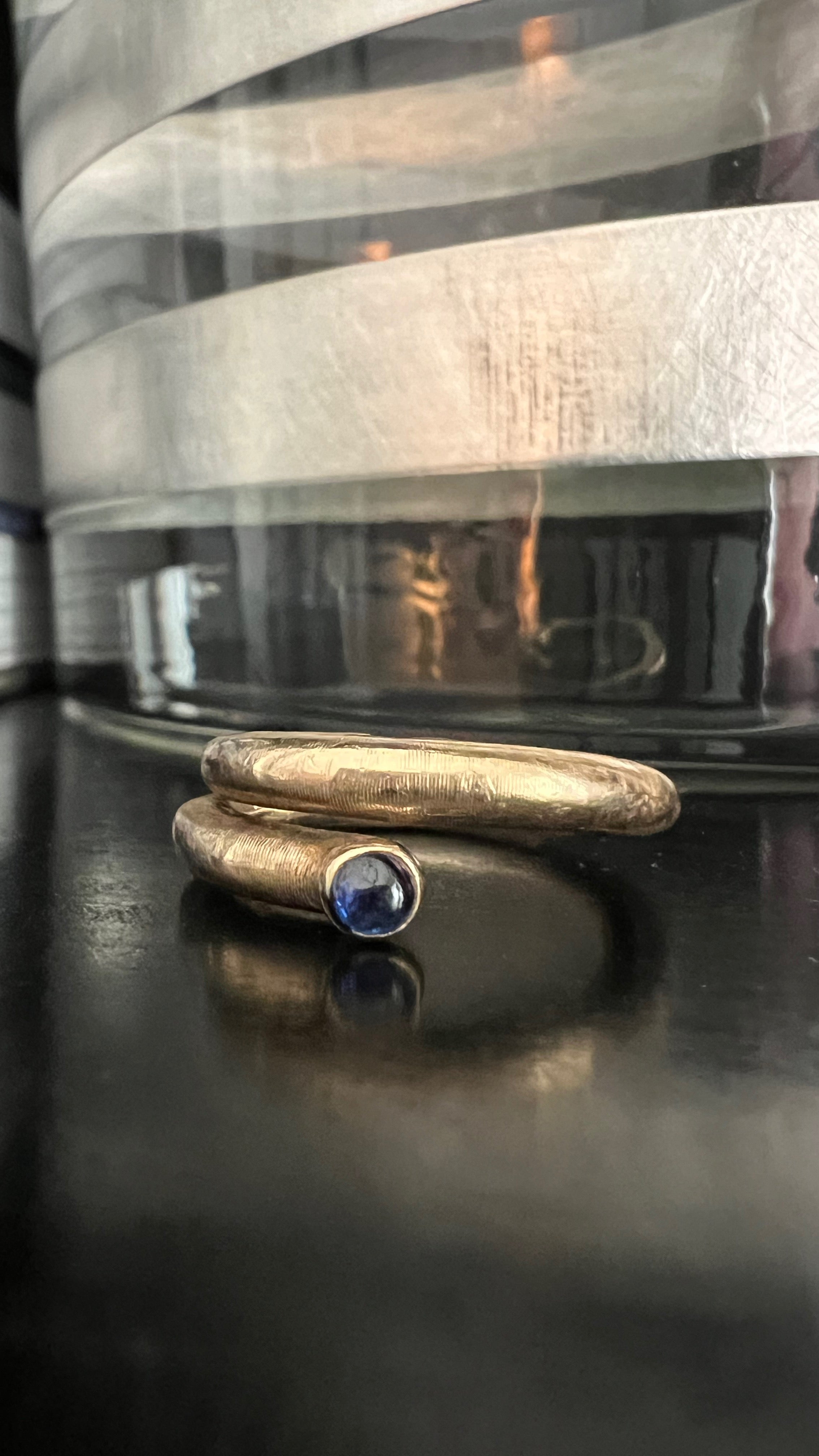 I was instantly drawn to this textured, sort of rustic wrap ring. It has a bit of a nail ring or snake ring vibe, yet it's a thing of its own, down to the little cabochon sapphire at the end.