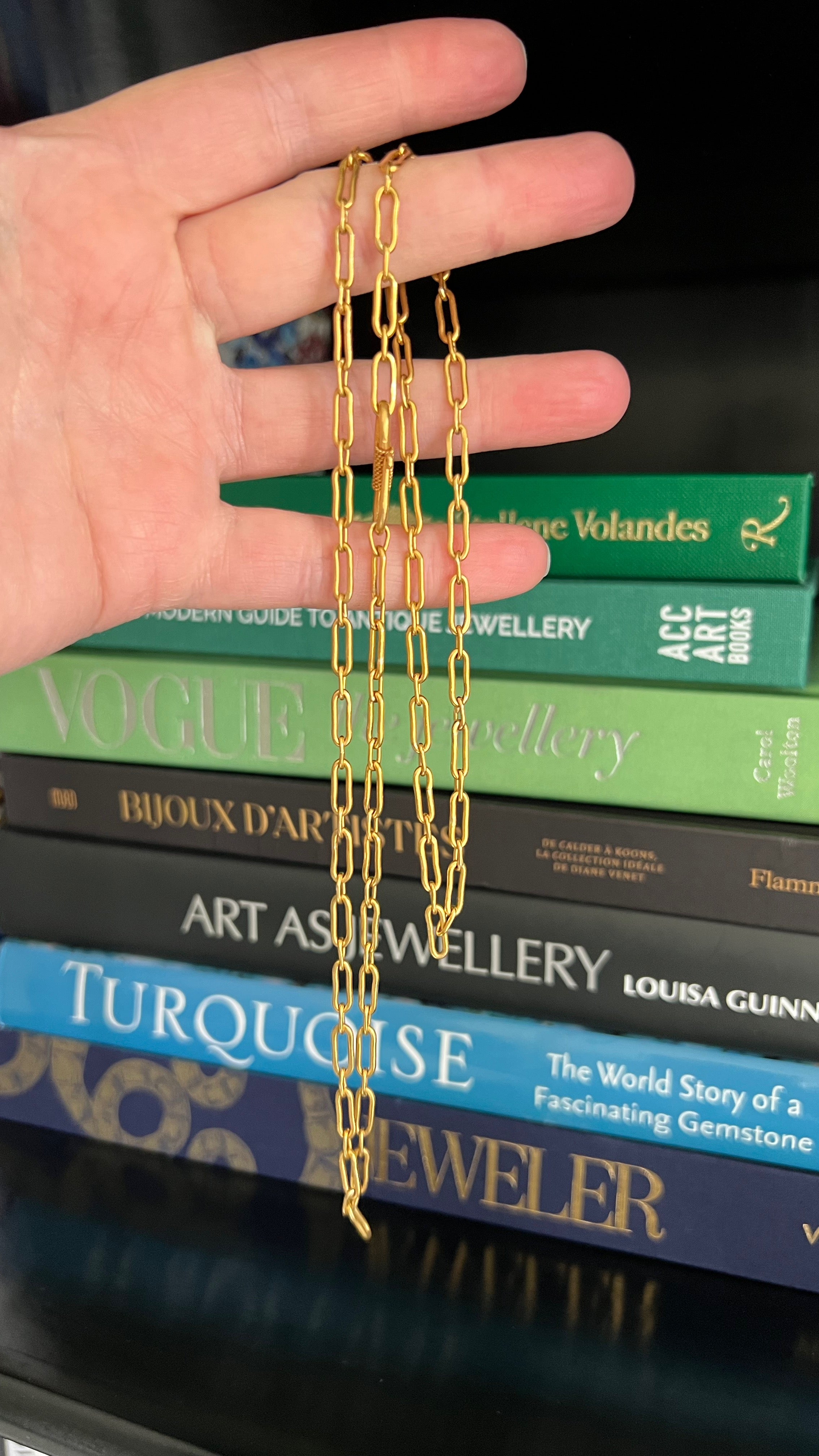 I was drawn to this chain for both the color and the construction. You can see how each and every link is carefully hand wrought, creating an old-world, sort of ancient look.