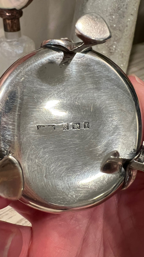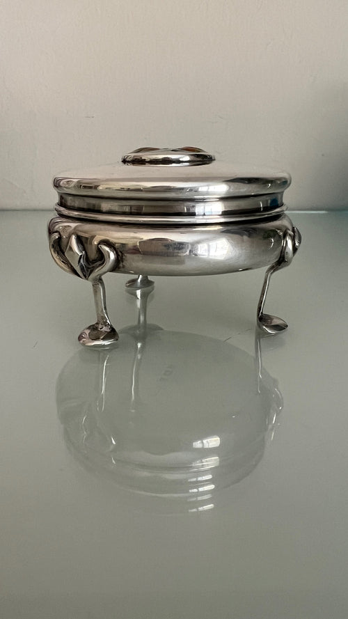 This antique box was made in England in 1905 by William Hair Haseler for Liberty & Co. It is fully hallmarked with his initials (WHH), the anchor, the lion, and the "f" for the year.