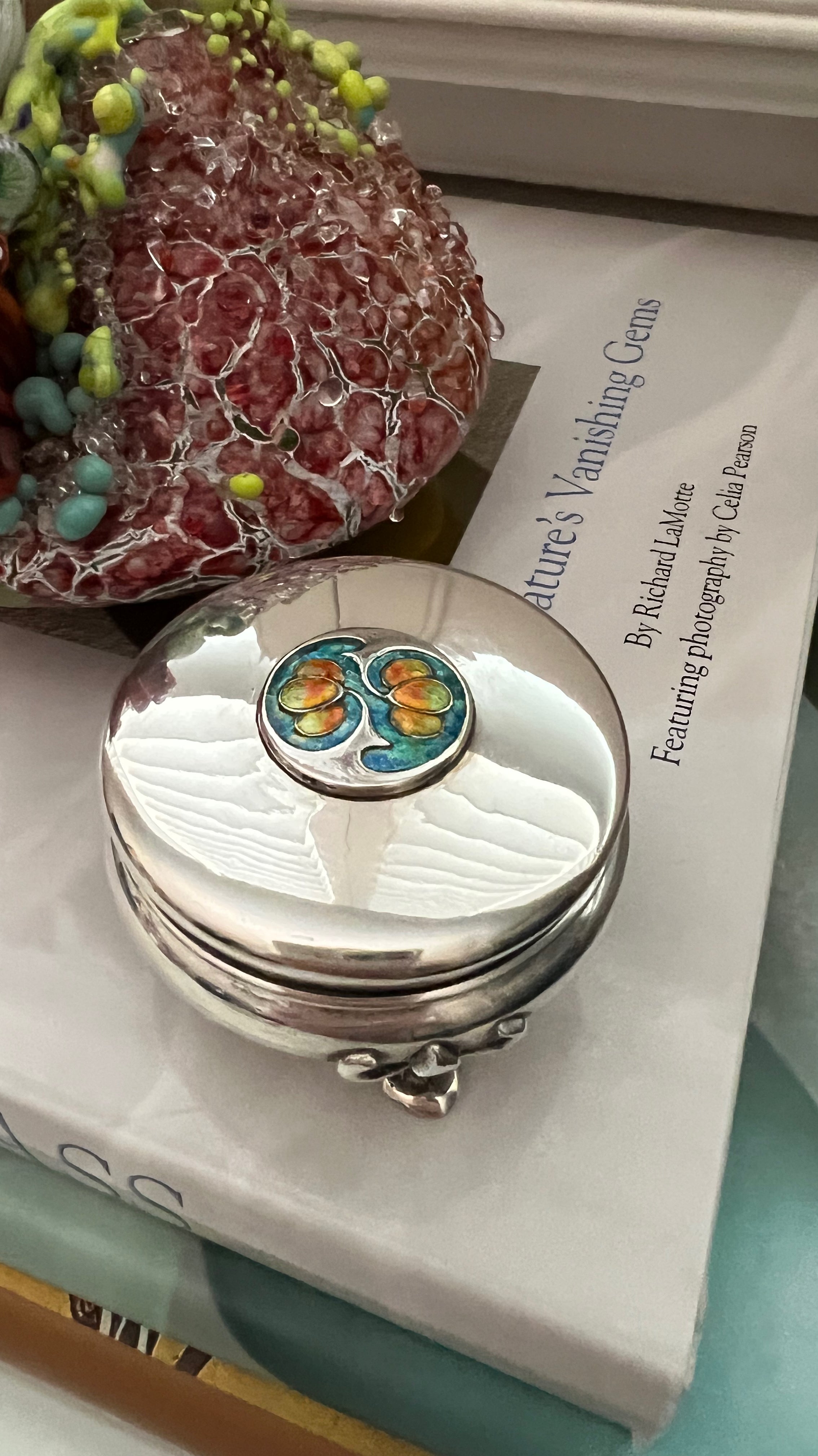 First, I was taken with the vibrant colors of the enamel on the lid of this box. Then, I was enamored with the three-footed design. It's certainly eye-catching, don't you think?
