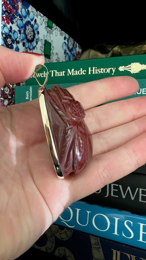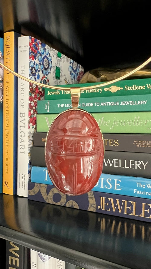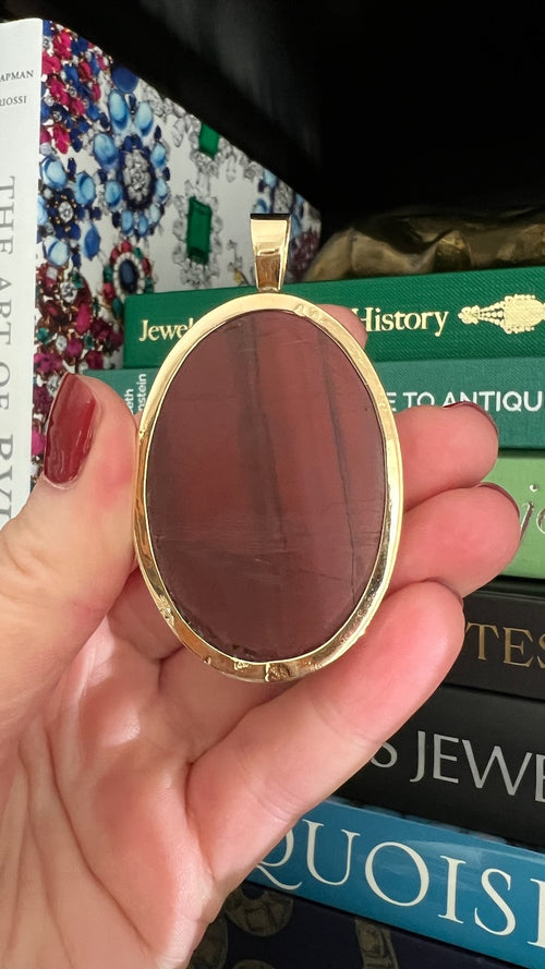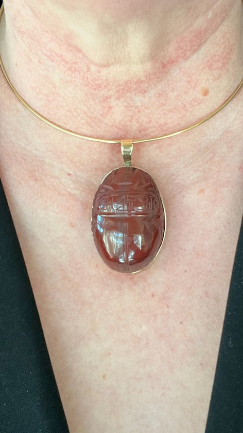 This is a "WOW!" pendant, for sure!! This vintage scarab is hand carved out of a luscious piece of jasper, and set in 14K yellow gold.