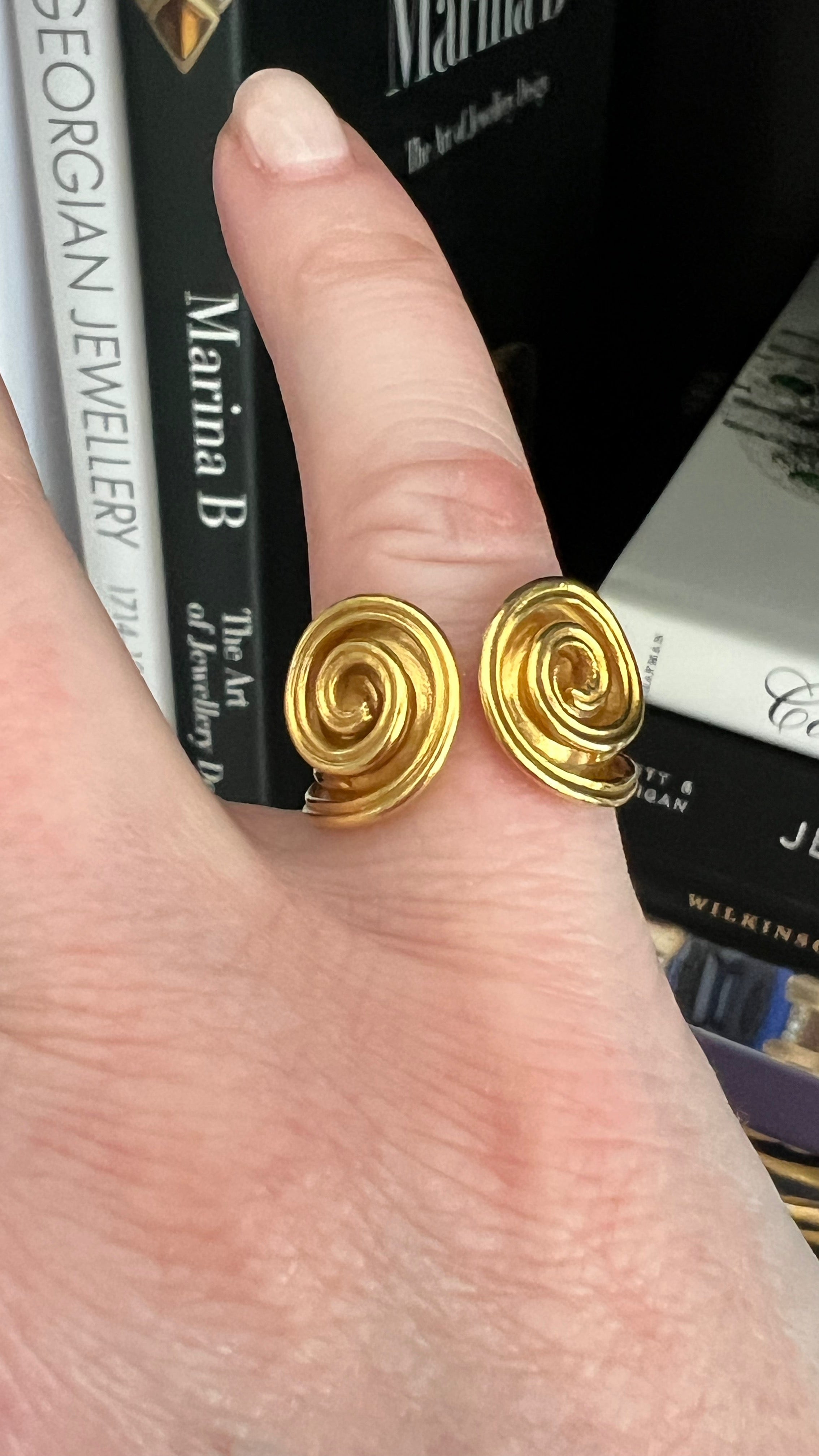 This Greek swirl ring is crafted in solid 18K gold and has a very deep yellow, buttery tone.